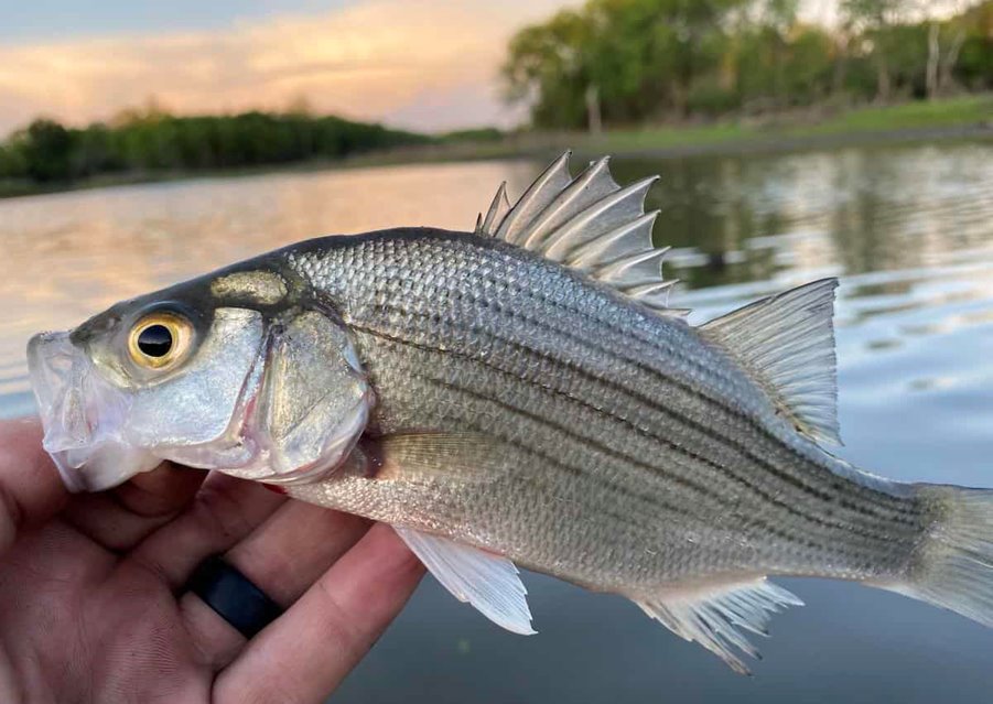Description: White bass have a streamlined, elongated body with silvery sides and a slightly greenish to bluish tint on the back. They have distinct horizontal stripes on their sides, which are usually dark and well-defined. White bass are generally moderate in size. Adult fish typically range from 10 to 17 inches in length. The weight can vary, but they are not as large as some other bass species. They commonly weigh between 1 to 3 pounds. They are found in a variety of freshwater habitats, including lakes, reservoirs, rivers, and streams). White bass prefer clear water but can adapt to different conditions.