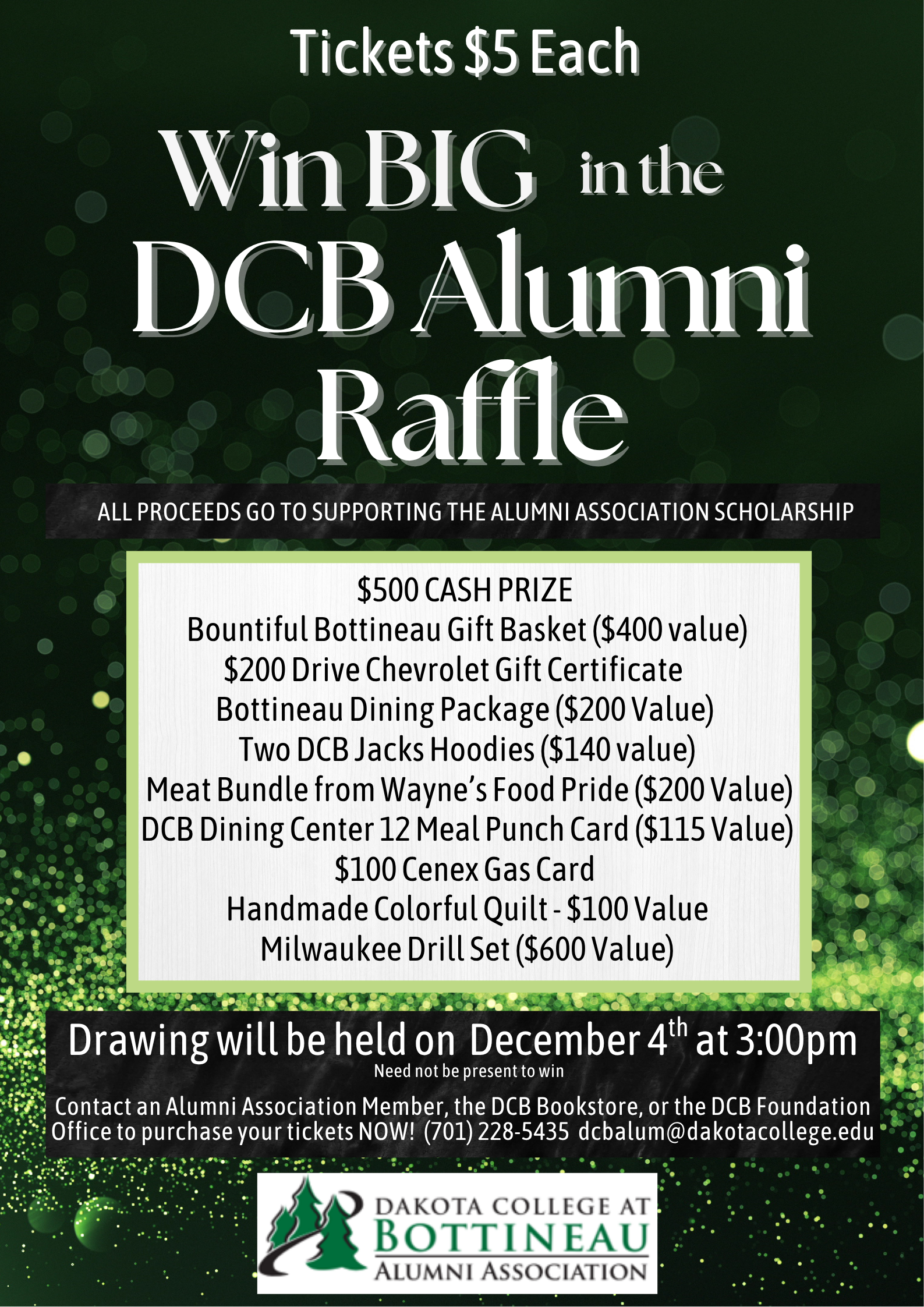 Evergreen, our largest fundraising event, is held annually in the fall. This fundraiser includes a buffet dinner, silent auction, raffles and a live auction. All gift items for this event are generously donated by businesses, individuals, organizations, artists and craftspeople from Bottineau and the surrounding area. Proceeds from Evergreen are used for student scholarships, recruitment and the promotion of Dakota College at Bottineau.