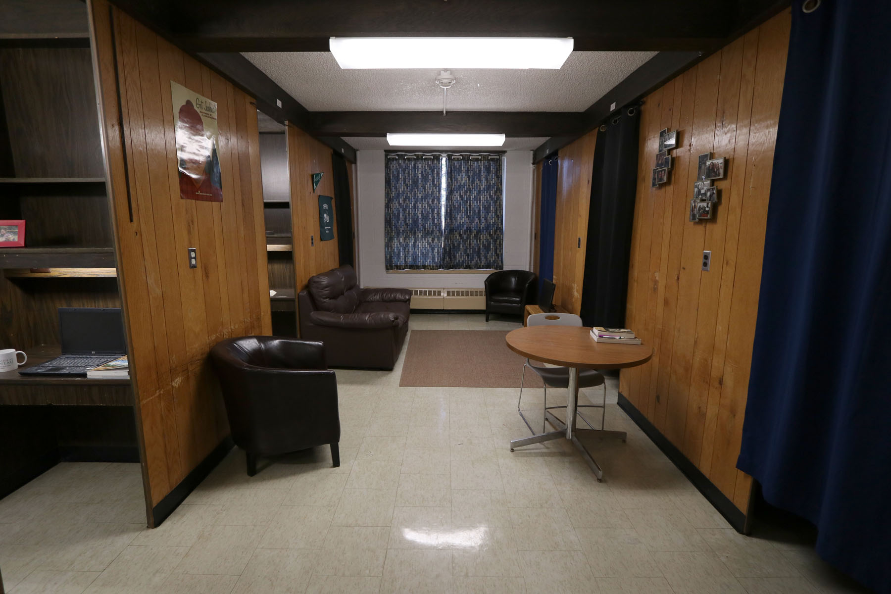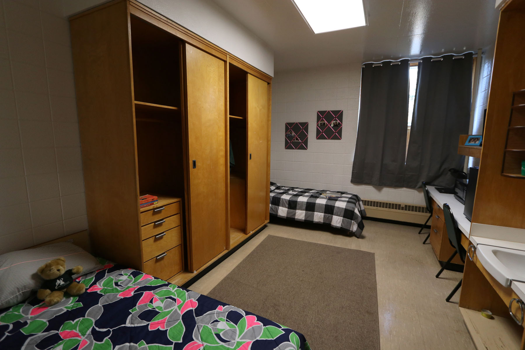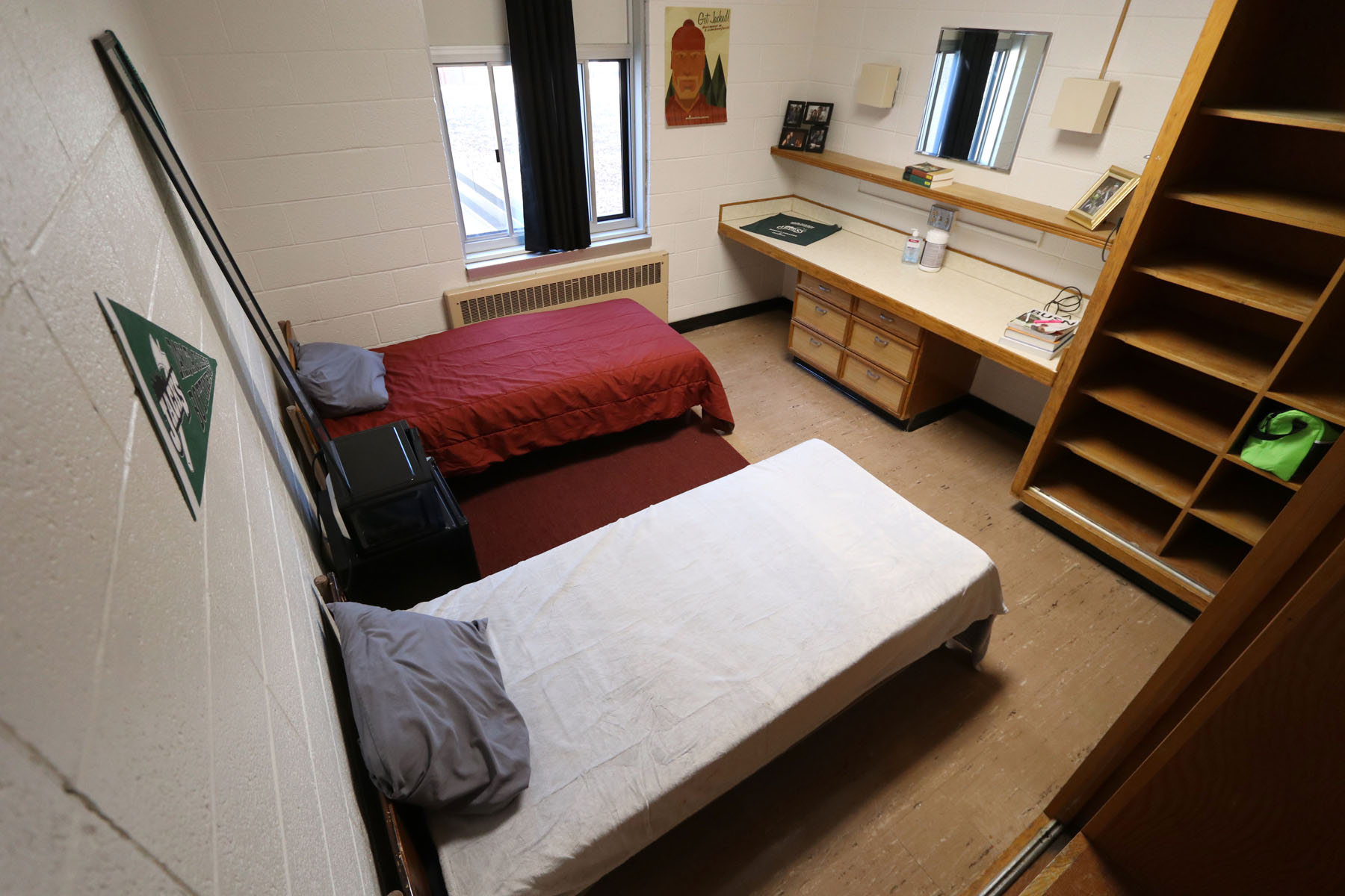 Mead Hall is the men’s residence, rooms are available in single or double occupancy. Please request to live on the ‘Quiet Floor’ if you prefer longer quiet hours and study time. Each room in Mead Hall has two twin size beds, two or four closet spaces, a desk with drawers and two chairs. Shared bathrooms are available in each wing for residents.